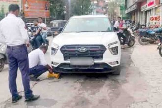 बेतरतीब खड़ी दुपहिया वाहनों को उठा रही क्रेन