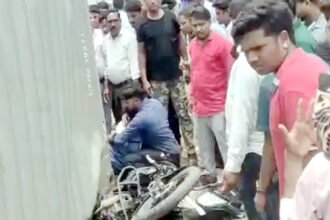 बाइक सवार युवक पर पलटा कंटेनर, हाइवे पर लगा जाम