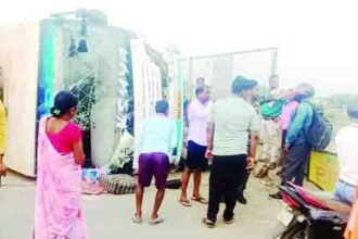 रेलवे ओवरब्रिज से टकराकर दुर्गा बस पलटी