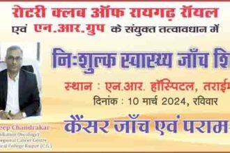 रोटरी क्लब रायगढ़ रॉयल द्वारा 10 मार्च को तराईमाल में नि:शुल्क कैंसर जाँच एवं स्वास्थ्य शिविर का आयोजन