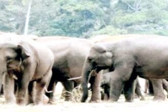 हरदी गांव पहुंचा हाथियों का दल, तालाब में पानी पीते दिखे गजराज़